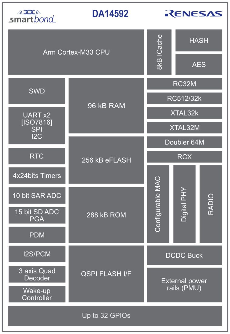 Le système sur puce (Soc) DA14592 est « la plus faible consommation d’énergie et le plus petit appareil Bluetooth LE multicœur ». Selon la société, la conception de cette puce a été réalisée en faisant des compromis judicieux entre la mémoire intégrée à la puce et la taille de la puce.