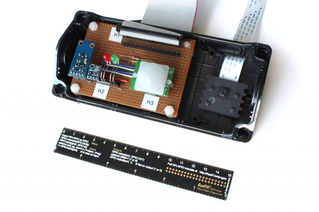 Vous pouvez voir (de gauche à droite) le capteur de lumière, le capteur de pression, les LED, le PIR et le module caméra. Cette boîte a un couvercle en plastique transparent. Cette semaine, j’ai effectué quelques tests avec le capteur PIR. J’avais prévu de le monter à l’intérieur et de le laisser regarder à travers le couvercle transparent. Cependant, j’ai trouvé que cela ne fonctionnait tout simplement pas derrière le plastique. Donc, cette semaine, je vais percer un trou dans le couvercle transparent du boîtier et monter le capteur. Le joint peut être scellé avec du mastic silicone. Le module caméra sera collé au couvercle et restera protégé à l’intérieur de la boîte.