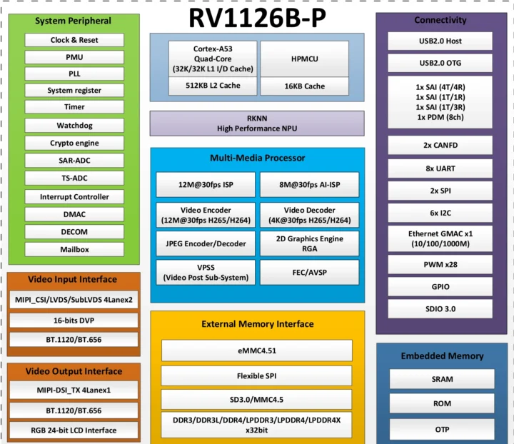 Le Rockchip RV1126, un SoC équipé d’un processeur quad-core ARM Cortex-A7, a été lancé en 2021. Cependant, le modèle RV1126B-P fait peau neuve avec ses quatre cœurs Cortex-A53 et son NPU amélioré à 3 TOPS. Cette version Mini1126B-P représente une avancée par rapport à la version précédente du MINI1126, utilisant dorénavant le nouveau SoC. Plongeons dans les détails.