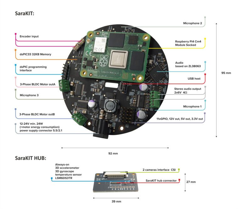SaraKIT est une carte de support pour le système sur module Raspberry Pi CM4 avec des contrôleurs de moteur BLDC et une gamme de capteurs pour la robotique, la prise en charge de la commande vocale basée sur ChatGPT via trois microphones et une puce audio ZL38063, et deux connecteurs MIPI CSI pour caméras. .