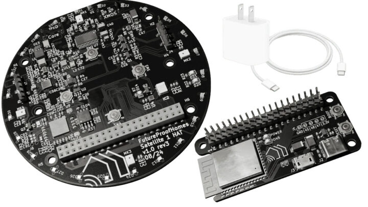 Le Kit Satellite1 Dev de Futureproomes’s Satellite1 est un assistant vocal bricolage composé d’un WiFi ESP32-S3 et d’un tableau Bluetooth exécutant l’esphome et un «chapeau» audio basé sur le processeur audio XMOS XU316 conçu pour la compatibilité des assistants à domicile.