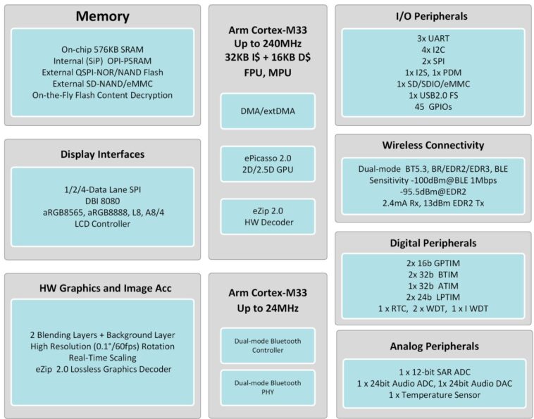 Sifli SF23LB52J est une partie de microcontrôleur Bluetooth 5.3 de la famille SF32LB52X avec deux cortex-M33 dans Big.Little Configuration avec un noyau à haute performance de 240 MHz pour l’application utilisateur / GUI et un noyau à faible puissance de 240 MHz pour gérer la pièce Bluetooth.