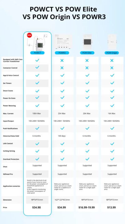 De plus, il peut mesurer des courants allant jusqu’à 100 A, ce qui est nettement supérieur aux modèles précédents. Cela le rend adapté à la mesure de la consommation d’électricité au niveau du disjoncteur principal, de l’énergie générée par les panneaux solaires ou même des chargeurs domestiques de véhicules électriques (VE). Le SONOFF POW Ring, que nous testons aujourd’hui, n’est pas seulement un compteur d’énergie intelligent mais aussi un interrupteur, ce qui signifie qu’en plus de mesurer la consommation et la gestion de l’énergie, il dispose également d’un relais de petite taille. Le POW Ring fonctionne via WiFi et est géré à l’aide du même logiciel eWeLink que les autres appareils SONOFF. Avant de plonger dans les détails du POW Ring, jetons un coup d’œil à un tableau de comparaison avec d’autres membres de la famille POW.