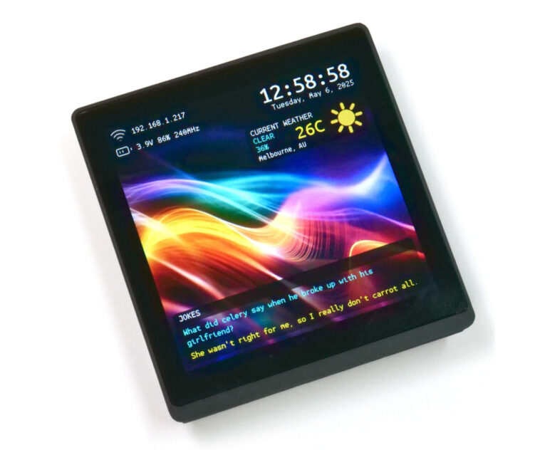 Le Squixl Devkit est expédié avec un firmware Arduino développé avec Platformo, mais l’ide Arduino sera bientôt pris en charge également. Le firmware d’expédition s’appuie sur la bibliothèque Squixl et est conçu pour présenter les capacités du Devkit ESP32-S3 et propose un gestionnaire WiFi pour la configuration initiale, une horloge, un affichage météo local utilisant une clé API Open Weather, un affichage de blague aléatoire, etc. Vous trouverez le code source du firmware d’expédition sur le référentiel GitHub Squixl-Devos, et il y a un référentiel séparé avec des échantillons Arduino et LVGL, et un firmware Micropython. La prise en charge de CircuitPython est également en cours.