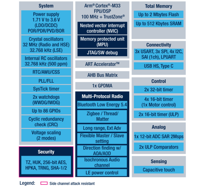 Le STM32WBA6 est une évolution de la famille STM32WBA introduite l’année dernière, en particulier des STM32WBA54 et STM32WBA55 avec plusieurs des mêmes fonctionnalités SESIP (Norme d’évaluation de sécurité pour les plates-formes IoT) Certification de sécurité de niveau 3, mais obtient plus de mémoire et de flash avec 512KB de SRAM et jusqu’à 2mb de flash. La nouvelle famille STM32WBA6 gagne également une interface USB OTG à haute vitesse et des interfaces numériques supplémentaires telles que trois ports SPI, quatre ports I2C, trois USArts et un LPUART.