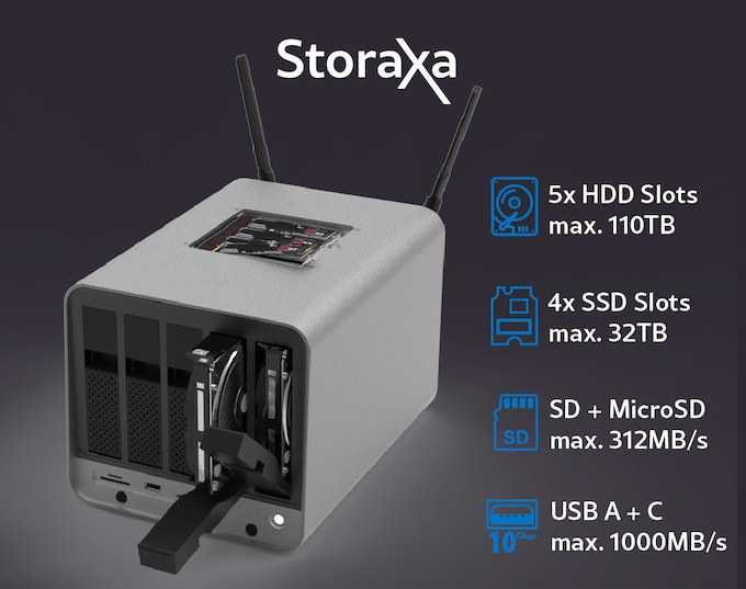 Le Storaxa est un appareil polyvalent alimenté par un processeur Intel Celeron N6005 Jasper Lake qui fonctionne comme un NAS SATA à 5 baies, qui peut également prendre jusqu’à quatre SSD NVMe, un centre multimédia 4K avec des interfaces HDMI et DisplayPort, et un Routeur WiFi 6 équipé de quatre ports 2,5 GbE.