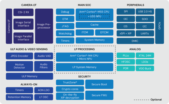 - Domaine de performance: ARM Cortex-M55 @ 400MHz + ARM ETHOS U55 NPU