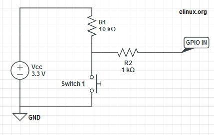 Pour attacher la broche d’entrée, nous la connectons au Vcc Broche 3,3 V, donc lorsque Commutateur 1 est ouvert, le courant passe GPIO IN et lit haut. Lorsque l’interrupteur 1 est fermé, nous court-circuitons le circuit et le courant est tiré vers GND; l’entrée a 0V, et lit bas! Alors que nous nous connectons Vcc directement à GND, qui pourraient laisser passer un courant dangereux, le grand R1 (10k ™) la résistance garantit que seul un petit courant est tiré. Pour rendre le circuit encore plus sûr, nous ajoutons le R2 (1kâ „¦) résistance pour limiter le courant vers et depuis GPIO IN.