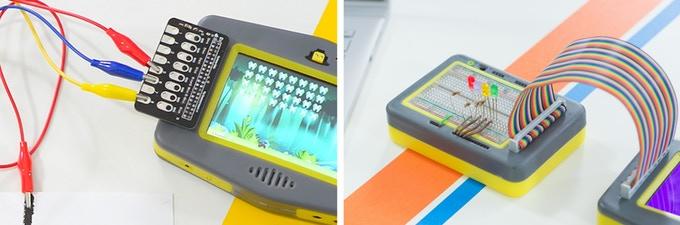 L’écran est entouré de deux contrôleurs plug-in qui le transforment en plateforme de jeu. En termes de calcul physique, il y a deux parties qui sont alimentées par l’en-tête à 40 broches sur le côté du Pip: un « HAT » (qui semble un peu trop petit pour être appelé un HAT, mais passons en revue cela pour un moment) qui est une carte tactile capacitive avec des clips de crocodile (ce qui en fait un peu comme un Makey Makey); et un module de planche à pain qui est relié au Pip via un câble ruban.