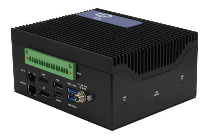 L’appareil est basé sur le SBC UP Xtreme i14 que nous avons couvert en juin dernier et est livré avec des sockets M.2 PCIe pour SSD NVMe, un port SATA, des interfaces 2,5GbE et GbE, la prise en charge des modules sans fil WiFi et 4G LTE/5G, quatre 8K. ports de sortie vidéo compatibles (HDMI, DP et USB-C) et trois ports USB Type-A, mais est logé dans un boîtier métallique sans ventilateur avec deux RS232/RS485 DB9 connecteurs et un bornier accessible de l’extérieur pour les signaux GPIO.