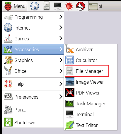 Le moyen le plus simple de voir quels fichiers et dossiers sont partagés sur votre réseau est d’utiliser le Gestionnaire de fichiers. Démarrez votre Raspberry Pi en mode Bureau et ouvrez le Gestionnaire de fichiers depuis le menu, sous Accessoires:
