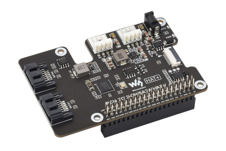 Waveshare PCIe to 2-CH SATA HAT + est un PCIe FFC à double canal à SATA 3.0 HAT + pour le Raspberry Pi 5, qui offre une alternative à faible coût au chapeau Radxa Penta Sata avec un support pour jusqu’à cinq disques SATA.