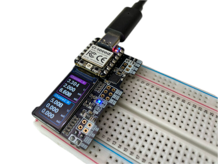 Le XIAO Powerbread est une alimentation et un compteur pour planche à pain compatible avec les cartes XIAO RP2040 ou ESP32 USB-C et équipé d’un écran LCD couleur affichant la tension, le courant et la consommation électrique en temps réel pour les rails d’alimentation 5 V et/ou 3,3 V.